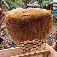 Honey bees are remarkable builders, creating perfectly symmetrical combs using only their legs. This Apis florea comb shows clear organization: deep honey chambers at the top, smaller worker cells below, followed by larger drone cells, and queen cells at the base—a marvelous design matching bee size and function.