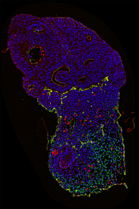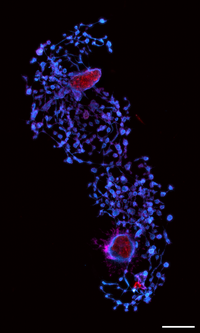 Image was acquired with a Thunder Microscope (63x objective), scale bar 20μm. Red = nuclei, cyan = tubulin, magenta = actin.